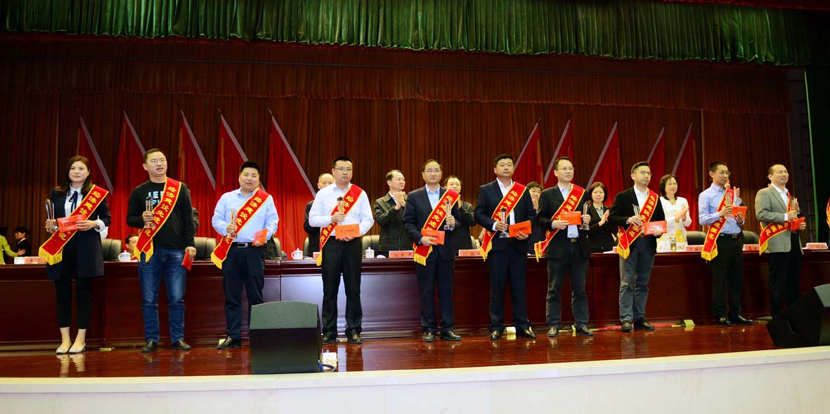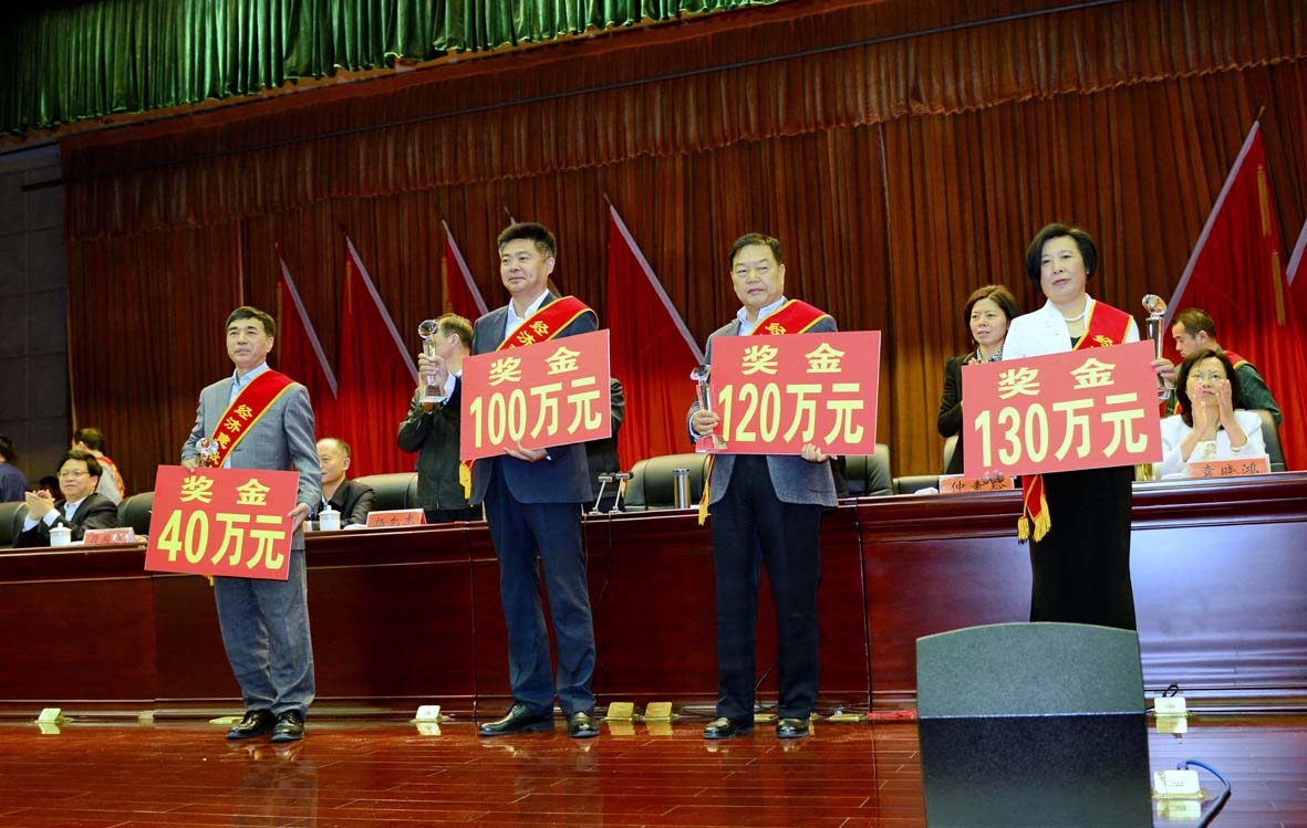会议对先进单位和个人进行表彰,集团董事局主席楚金甫荣获突出贡献企业家奖,奖励现金120万元,集团副总裁杨宏钊作为先进企业代表登台发言。