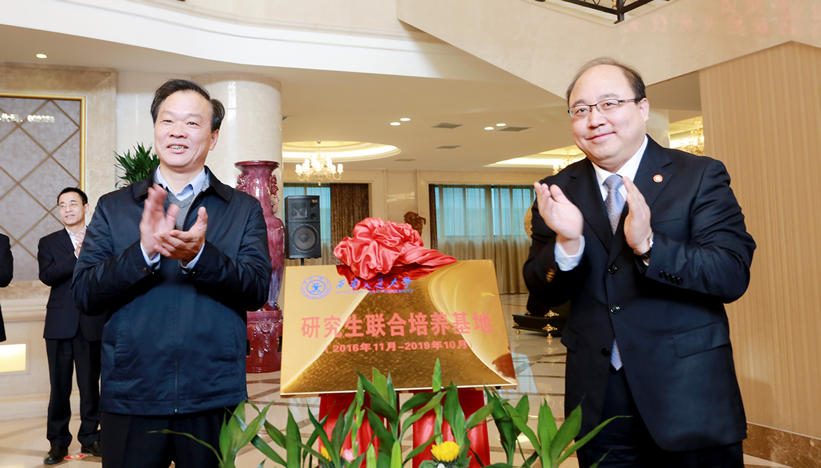 许昌市市长胡五岳、西安交大党委副书记宫辉共同为研究生联合培养基地揭牌;西安交大研究生院培养办公室主任郭炜、集团副总裁乔清周分别代表双方签订研究生联合培养基地合作协议。