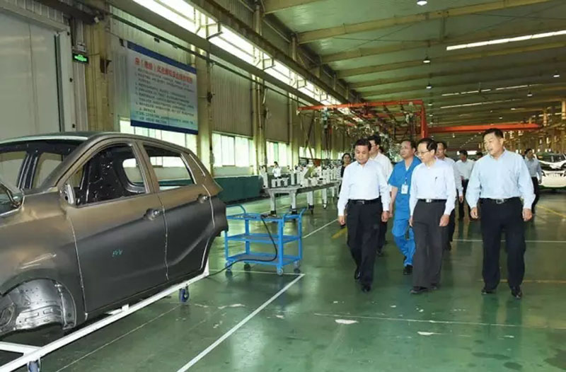 在调研中,陈清泰下车实地观摩,详细了解了电动乘用车焊接工艺。当了解到该焊接生产线主要承担集团全正向自主研发车型的车身焊接试制,有力促进了电动乘用车新车型的快速试制验证时,陈清泰表示赞许。在电动乘用车装配车间,看到一排排刚下线的电动乘用车,陈清泰一行十分感兴趣,详细询问了时速、充电时间、续航等各项性能指标。了解到电动乘用车通过国家轿车质量监督检测中心型式试验和碰撞试验,各项性能指标均符合轿车标准,由于采用了更高效、安全的电池管理系统和制动能量回馈控制系统,时速最高可达145公里,续航里程比其他品牌同等功率电动车多出30%,陈清泰频频称赞。