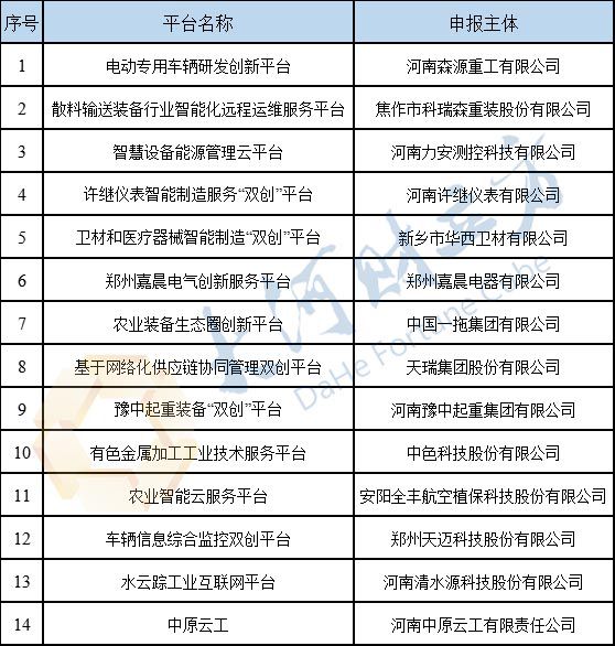 根据专家意见,经研究,拟确定河南重工有限公司——电动专用车辆研发创新平台等14个平台为2018年河南省制造业“双创”平台;郑州宇通集团有限公司——宇通制造业与互联网融合“双创”示范基地等5个基地为2018年河南省制造业与互联网融合“双创”基地。公示时间为2018年10月17日至2018年10月23日。