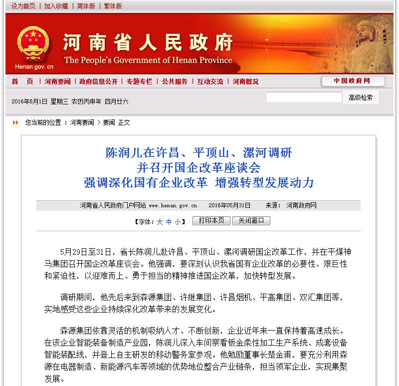 5月29日至31日,河南省省长陈润儿赴许昌、平顶山、漯河调研集团等企业。河南日报头版报道/河南省人民政府门户网站河南要闻中关于河南省省长陈润儿一行莅临集团视察调研的相关报道内容如下: