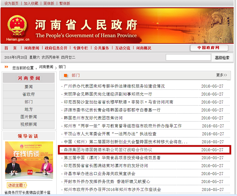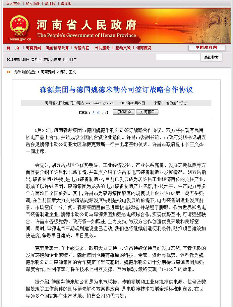 河南省人民政府门户网站河南要闻——集团与德国魏德米勒公司签订战略合作协议 发布日期: 2016-05-28 分享 加入收藏 5月27日,河南省人民政府门户网站河南要闻栏目发布新闻《集团与德国魏德米勒公司签订战略合作协议》。 原文链接:http://www.henan.gov.cn/jrhn/system/2016/05/27/010644282.shtml 上一条 许昌电视台对集团与德国魏德米勒公司签订战略合作协议进行特别报道 2016-05-24 下一条 许昌日报/许昌市人民政府门户网站/许昌电视台——我市第一个山地林光互补光伏发电项目并网发电 李建民出席并网发电仪式 2016-05-31